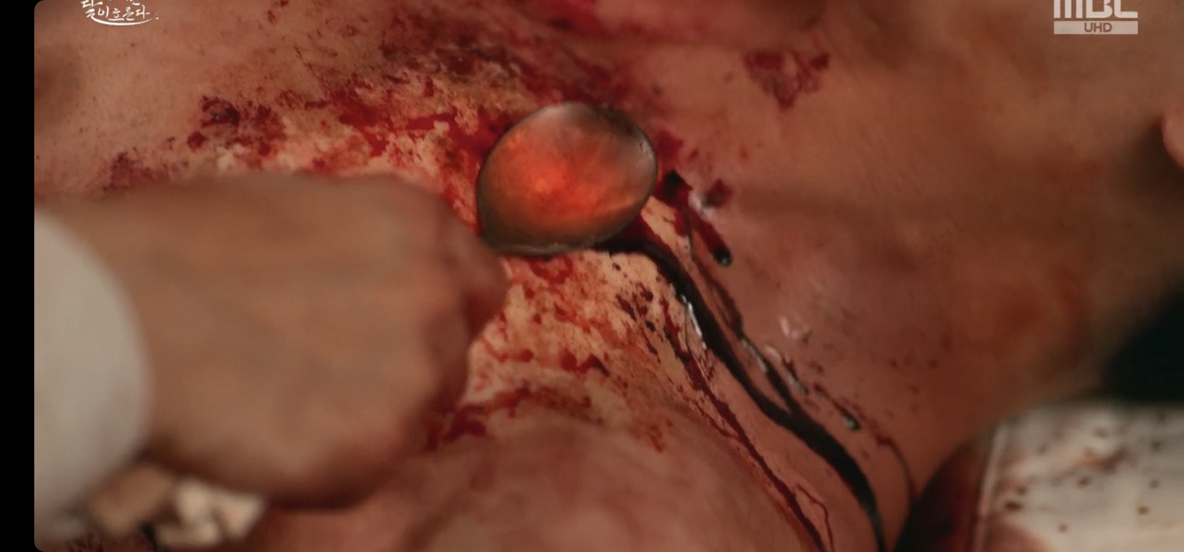총알을 빼고, 불로 지져 상처를 지지는 장면이 등장합니다.