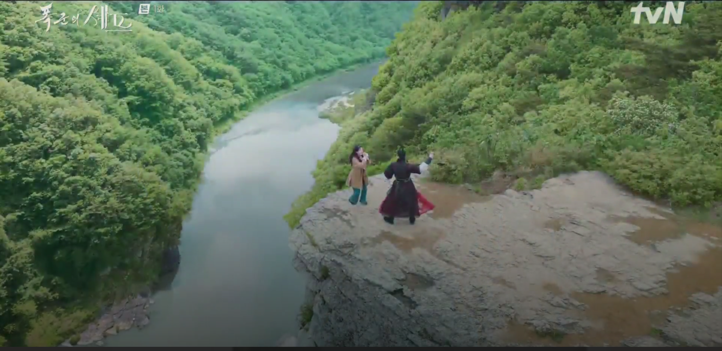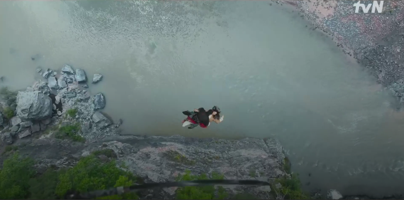 tvN 토일 드라마 <폭군의 셰프>의 1화, 2화에서 이헌이 활에 맞아 지영과 함께 추락하는 절벽 장면의